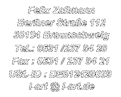 | Eigentümer der Domain L-ART.DE und entsprechend TDG / MDStV / BGB / usw. verantwortlich für Programmierung und Inhalte dieser Website : |